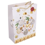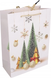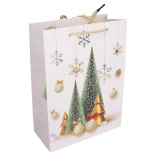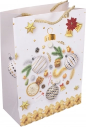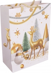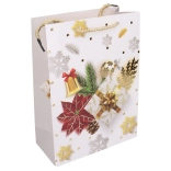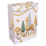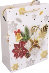 Pungă cadou stilată, mărimea S, cu dimensiunile 18 × 24 × 8,5 cm, ideală pentru ambalarea cadourilor mici. Oferă motive de Crăciun, execuție solidă și transport confortabil datorită mânerelor practice.