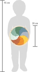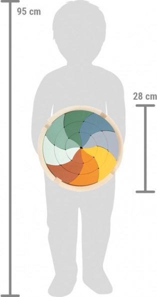 Acest puzzle din lemn, cu un design în culori moderne, aduce jocul liber în spirit Montessori. Copiii își exersează sortarea, asamblarea, crearea de modele și gândirea logică. După asamblare, ia naștere un motiv impresionant de mandală, care poate fi folosit și ca decor în camera copilului.