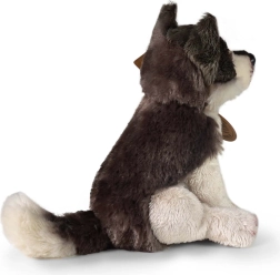 Blană fină și pufoasă în tonuri gri‑alb și broderii detaliate creează un lup drăgălaș și fidel realității, de care copiii se vor îndrăgosti pe loc.