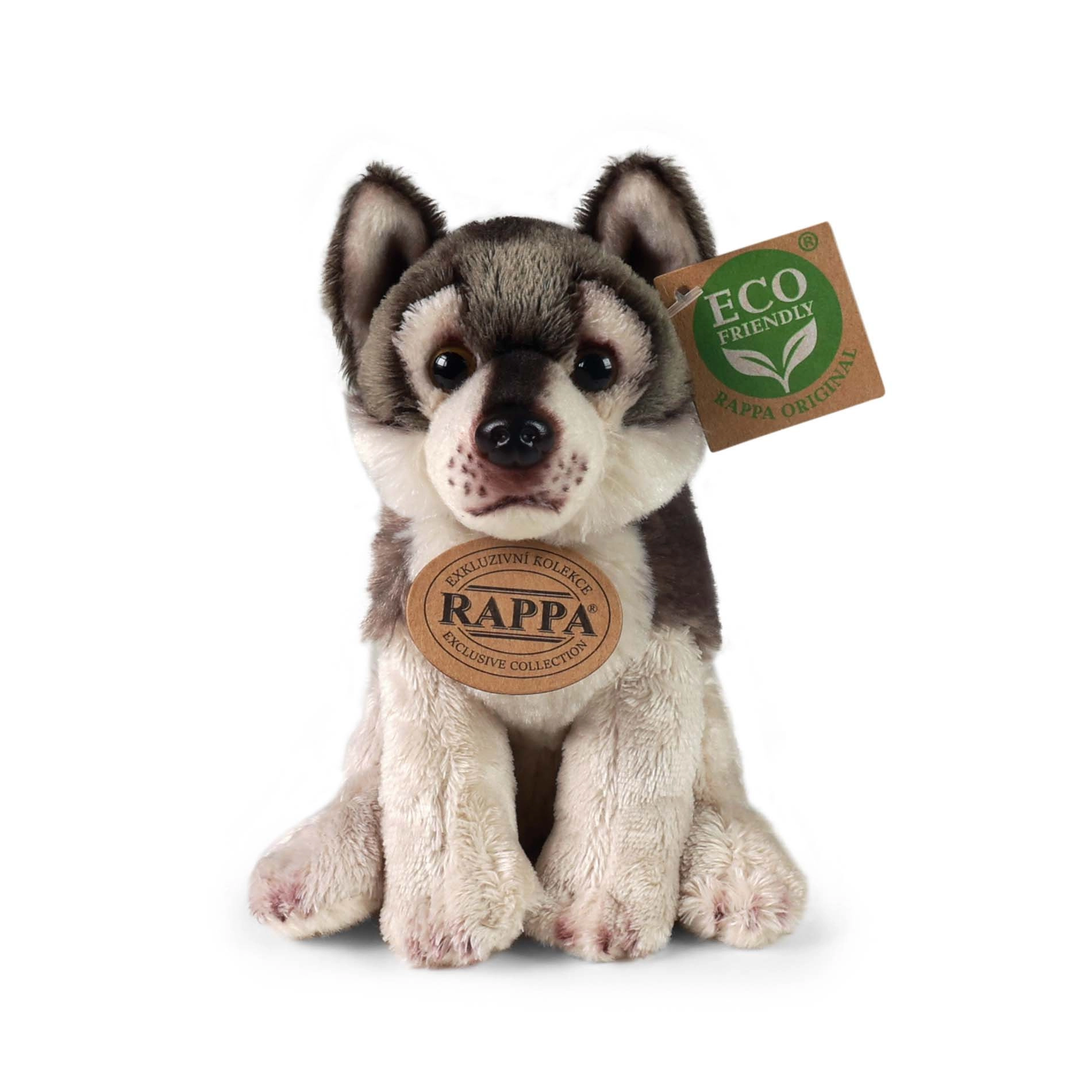 Un lup de pluș adorabil de la brandul Rappa, în poziție așezată, îi va încânta pe micii și marii iubitori de animale. Este realizat din pluș de înaltă calitate, cu umplutură moale ECO‑FRIENDLY din sticle PET reciclate. Oferă detalii realiste, prelucrare manuală și materiale sigure pentru copii de la 0+.