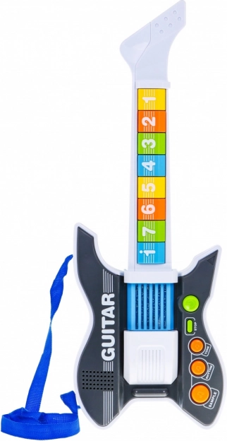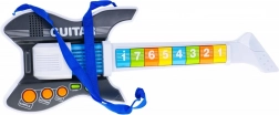 | Funcții | - buton de pornire/oprire, - butonul stop oprește muzica, - butonul „sample” redă 8 piese demo, - butonul „rhythm” redă 8 ritmuri de chitară, - butonul „tone” oferă 3 sunete diferite de chitară, - butoanele 1,7,6,5,4,3,2,1 sunt destinate cântatului, - luminile colorate de pe chitară clipesc în timpul cântatului, - cureaua poate fi purtată pe umăr. |