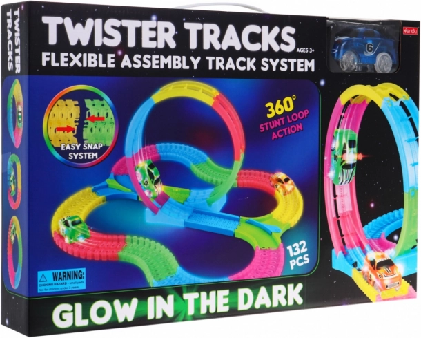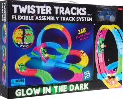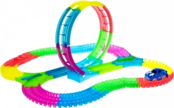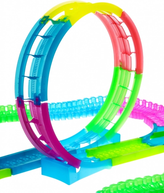 Această mare pistă de curse iluminată este destinată copiilor de la 3 ani. Produce un efect fluorescent și strălucește frumos în întuneric, ceea ce împreună cu iluminarea LED a mașinuței creează efecte uimitoare. Asamblarea simplă și ușurința în utilizare o transformă într-un accesoriu fantastic pentru orice joc de copii.