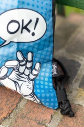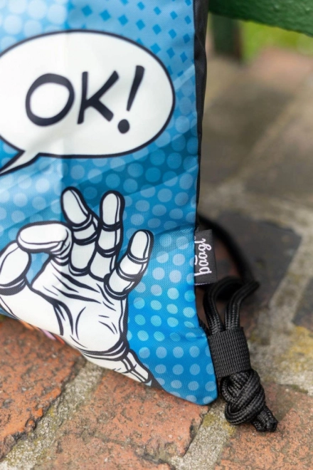 Designul cu robot și bule cu textul 'OK!' oferă săculețului un aspect unic pentru copii.
