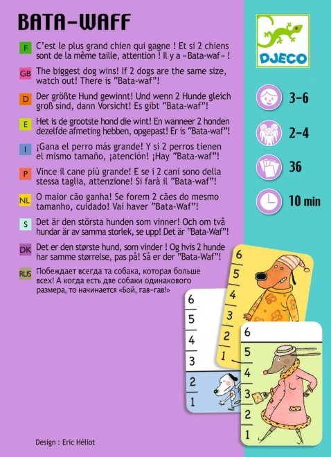 DJECO Bata-Waf este un joc de cărți captivant și ușor, care îi învață pe copii să compare mărimi și le antrenează în același timp spiritul de observație. Fiecare jucător întoarce cartea de sus, iar cel care are pe carte câinele mai mare ia toate cărțile puse jos. Dacă apare aceeași mărime, se aude formula magică „Bata Waf” și urmează un duel cu încă o carte.