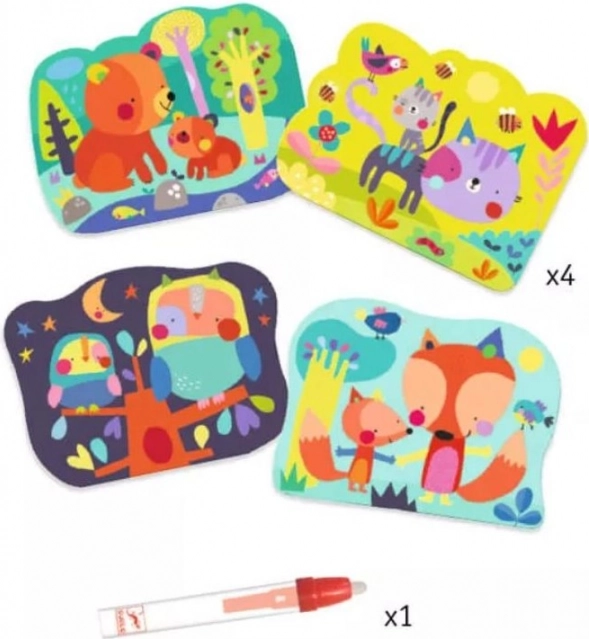 Cărțile de colorat cu apă DJECO oferă copiilor de la 18 luni creație simplă și curată fără carioci sau vopsele. Pe patru carduri rezistente, de 21 × 26 cm, apar la contactul cu apa personaje simpatice – un ursuleț, o pisicuță, o bufniță și o vulpe. După ce apa se usucă, imaginea se ascunde și jocul poate începe din nou.