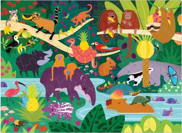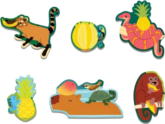 O junglă vie, cu animale și fructe tropicale, dezvoltă atenția și imaginația. Ideal pentru asamblare în familie și învățare prin joc.