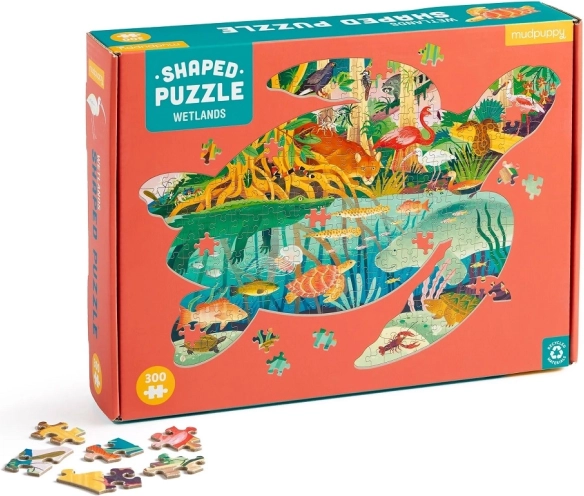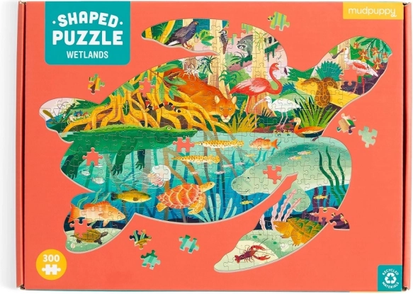 Tematica zonelor umede, ilustrată de Kaley McKean, le oferă copiilor și adulților o incursiune colorată printre aligatori, pantere, libelule și alte vietăți. Puzzle-ul final are forma unei țestoase, astfel că pe masă arată ca o decorațiune originală și este un cadou grozav pentru iubitorii naturii.
