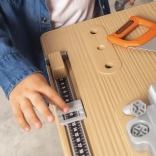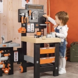 Atelier complet pliabil pentru micii meșteri, cu 100 de accesorii și 3 zone de lucru: atelier mecanic cu banc, stație de vopsit cu chiuvetă și zonă de instalații cu țevi. Include bormașină, menghină, fierăstrău circular și mașină de asamblat. Datorită panourilor laterale pliabile și roților, se transportă ușor și susține creativitatea, motricitatea fină și coordonarea mână–ochi.