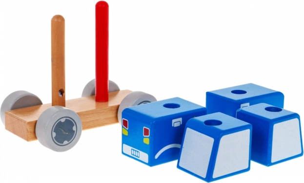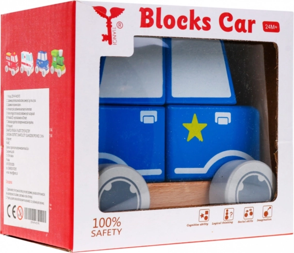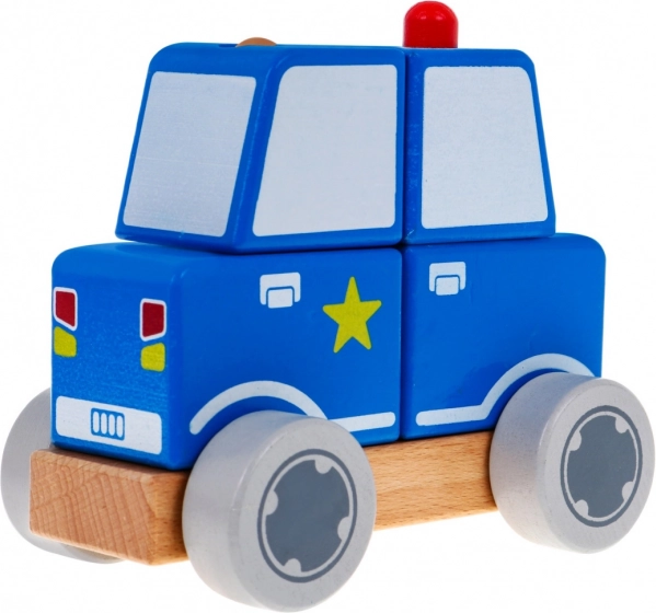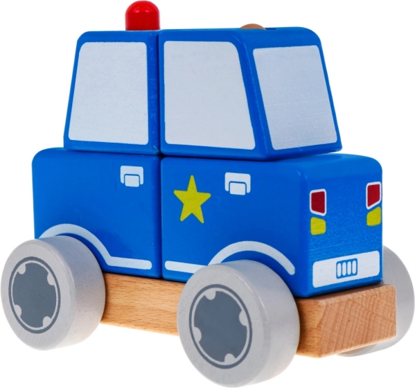 Cele patru cuburi din lemn se pun pe două dibluri și împreună creează o mașinuță de poliție realistă. Ideală pentru primele exerciții logice.