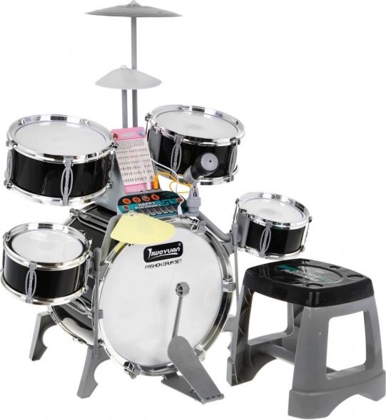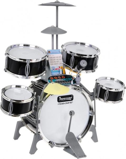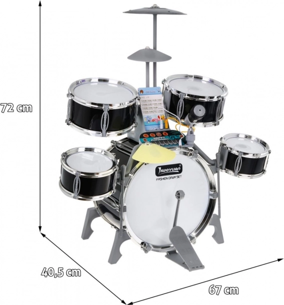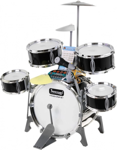 Setul de tobe multifuncțional pentru copii conține 5 tobe, 2 plăci electronice (din plastic) și o placă metalică, panou de control, microfon, 2 bețe și 6 carduri cu note pentru învățare ușoară a jocului. Setul este alimentat de trei baterii AA sau prin cablu USB.