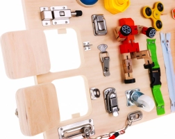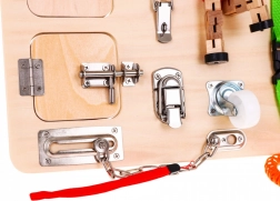 Tabloul conține numeroase elemente interactive precum încuietori, întrerupătoare și mecanisme de retur, care sprijină îmbunătățirea motricității fine și învățarea relațiilor cauzale.