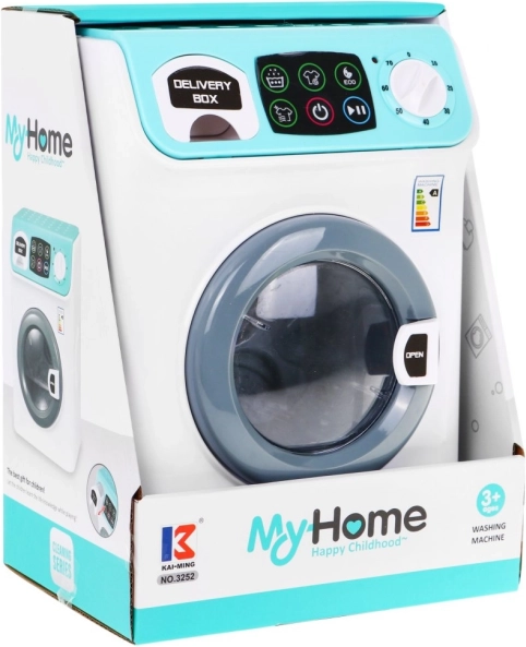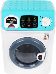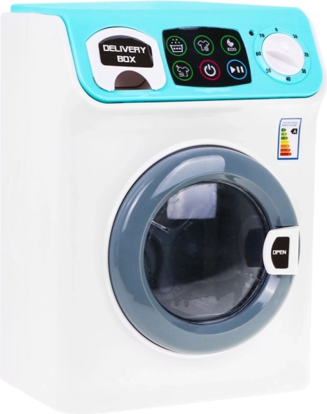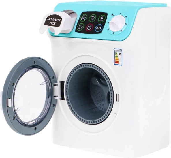 Mașina de spălat este albă cu elemente mentolate, are o ușă transparentă și butoane realiste pentru o experiență interactivă.