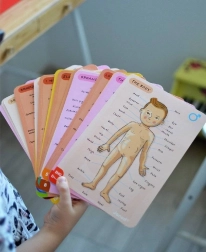 Sunt incluse 18 carduri clare, cu etichete în diferite limbi – ideal pentru extinderea vocabularului și primul contact cu limbile străine.