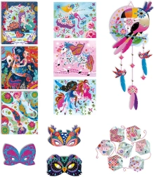 - Prins de vise (10 pene, șnur roz, motiv pasăre); Ghirlandă origami (25 de foi de hârtie origami, șnur roz); 3 carduri cu sclipici și paiete; 3 carduri mozaic cu piese din spumă; 3 măști de zgâriat și racletă din lemn