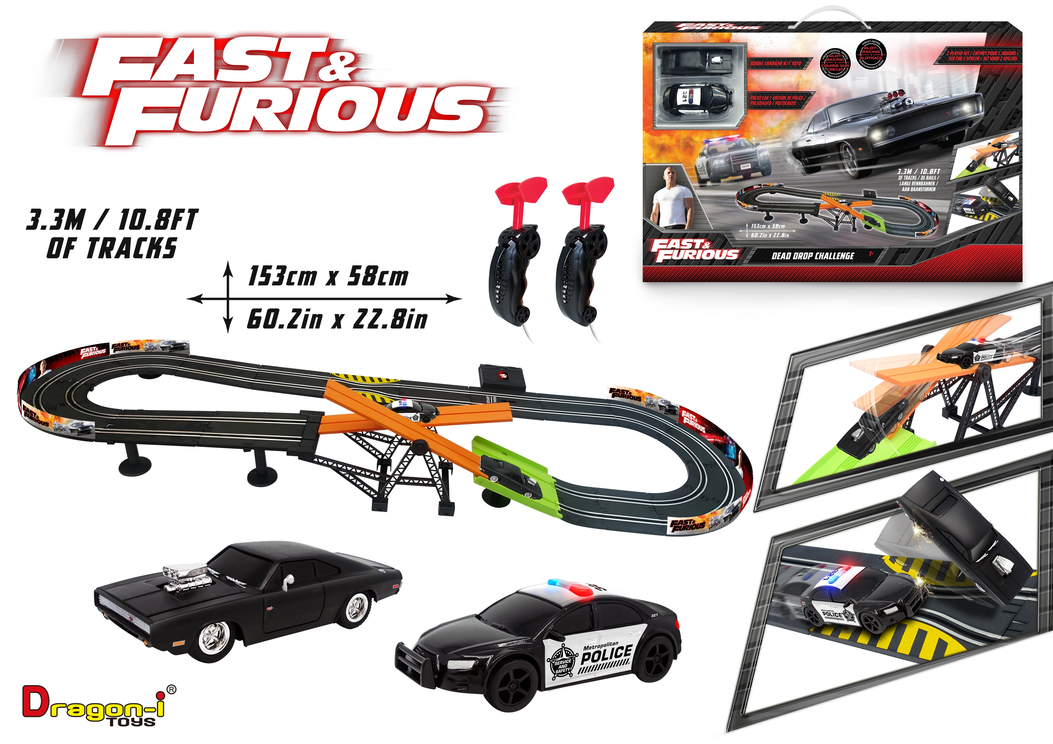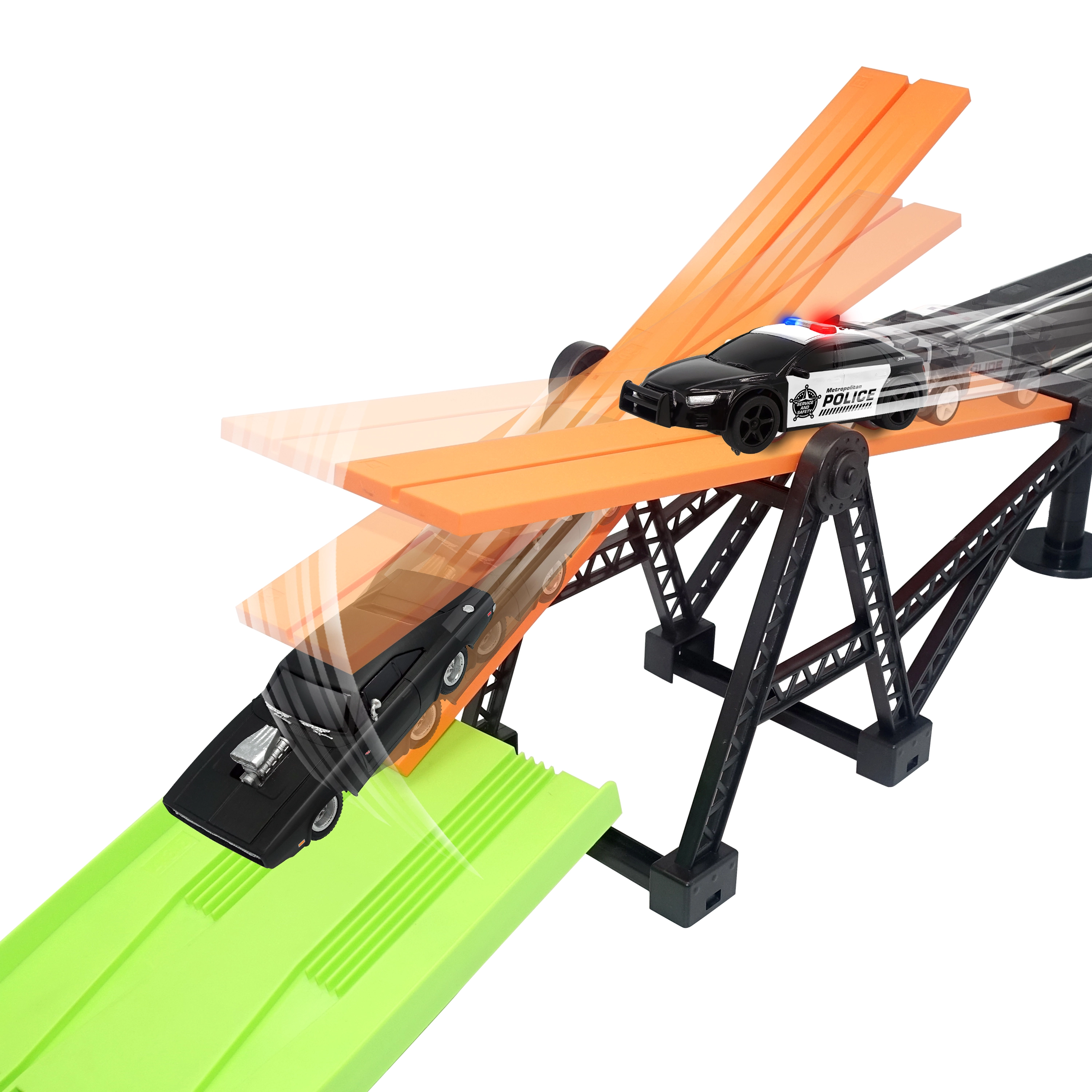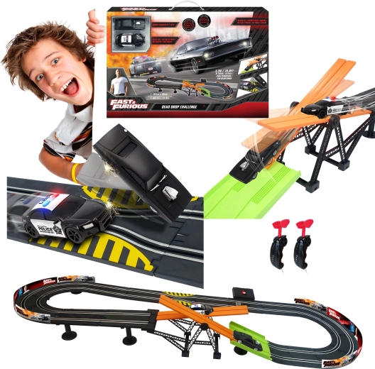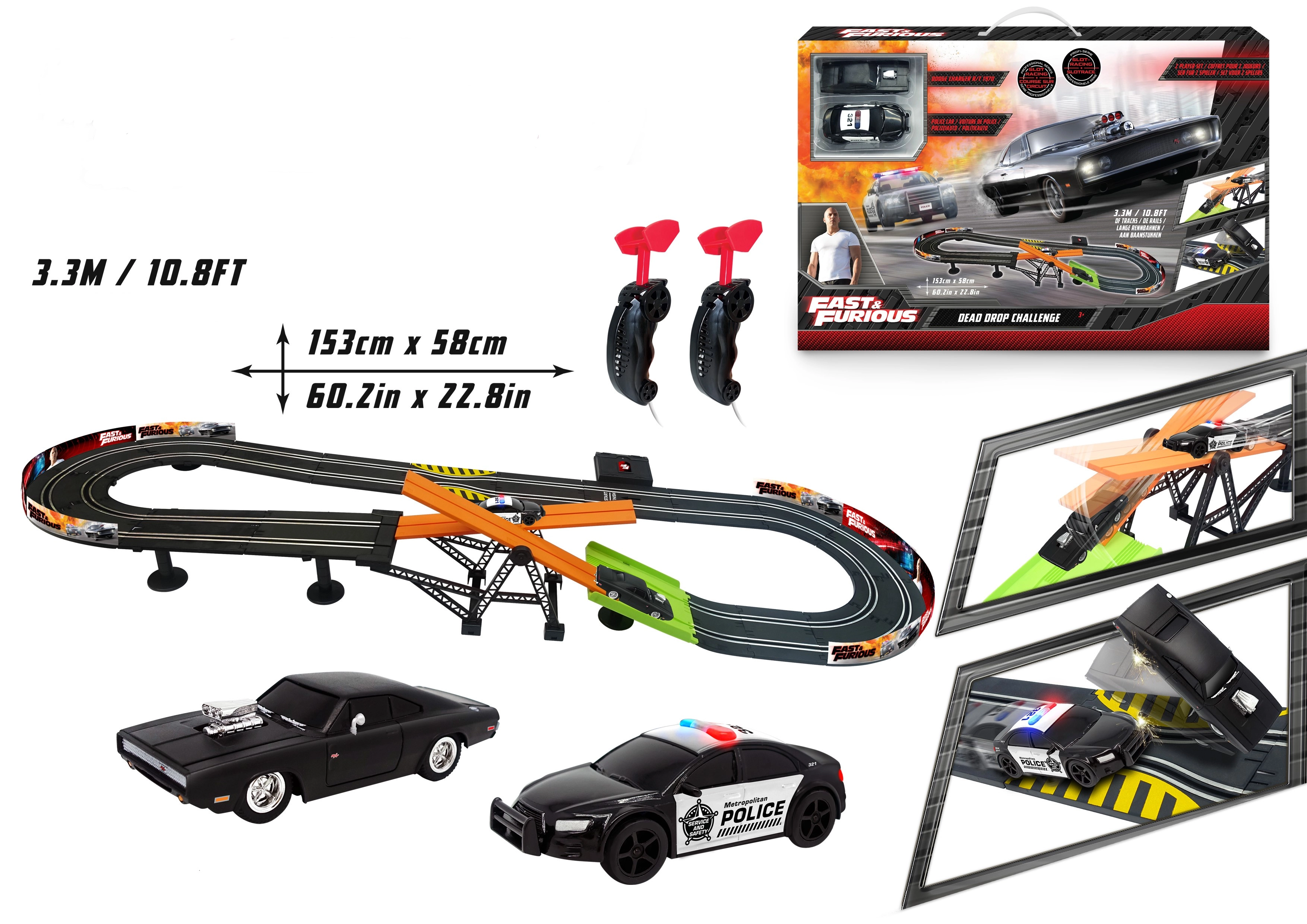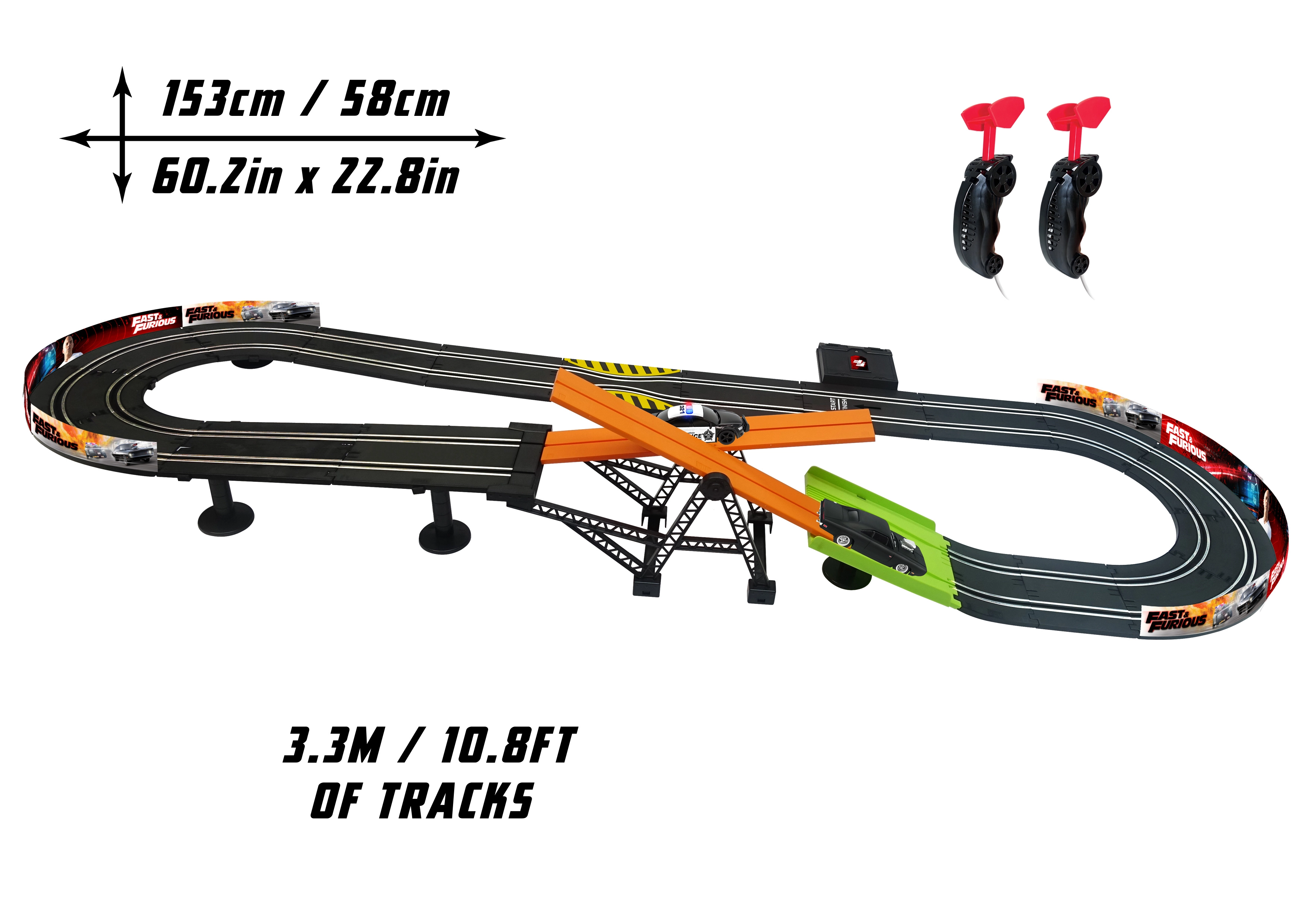 Pistă auto cu obstacole Fast and Furious. Lungimea traseului 3,3 m. Dimensiuni 153x58 cm. 2 mașini incluse. 6xAA baterii pentru cutia de baterii nu sunt incluse. Instrucțiuni de asamblare incluse.