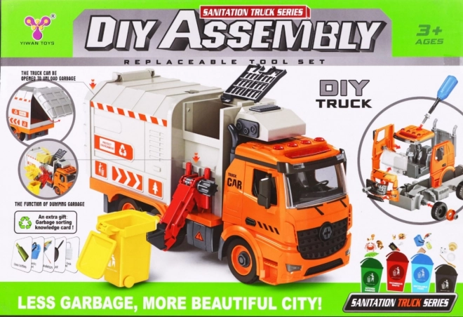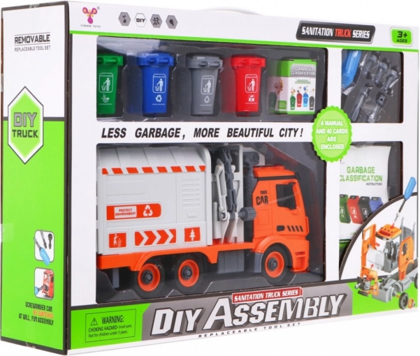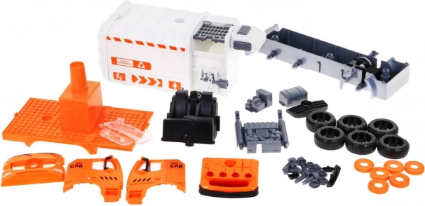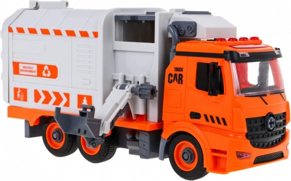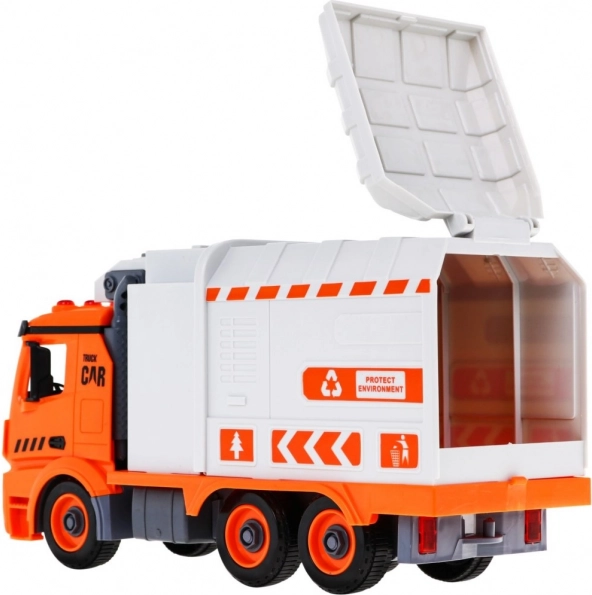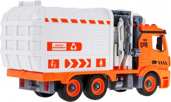 Cu șurubelnița cu biți interschimbabili, copilul demontează și reasamblează mașina. Brațul lateral ridică și golește containerele ca la o autospecială reală de salubritate.