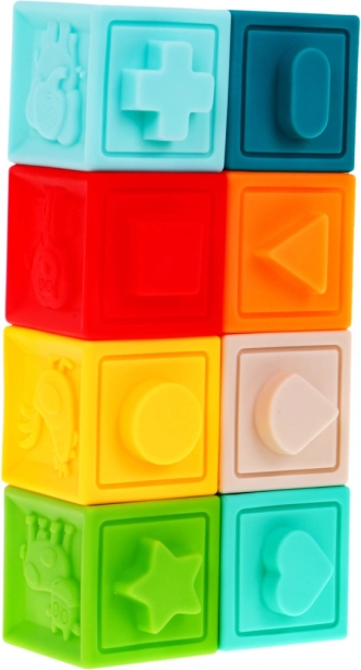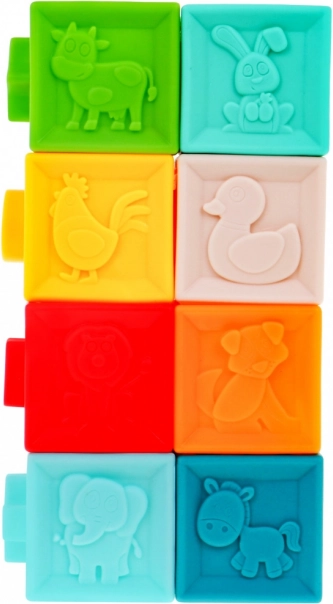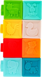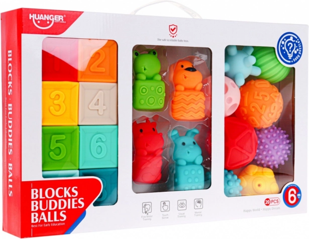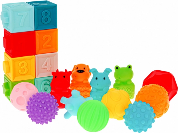 | | Setul de jucării senzoriale moi și sigure este destinat copiilor de la 6 luni. Jucăriile sunt fabricate din materiale 100% potrivite pentru copii. Stimulează imaginația, mintea, vederea și auzul. Elementele setului pot fi strânse liber de către copil, câștigând astfel forță în mâini. La strângere emit sunete care trezesc interesul copilului. Setul este format din 20 de elemente: conține 4 animăluțe, 8 mingi și 8 cuburi. Fiecare element are o textură și o culoare diferită, oferind copilului diverse stimuli pentru simțurile sale. |
