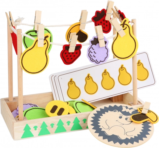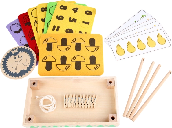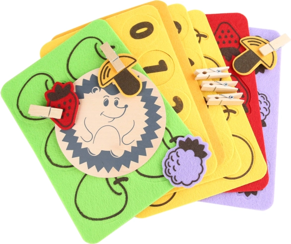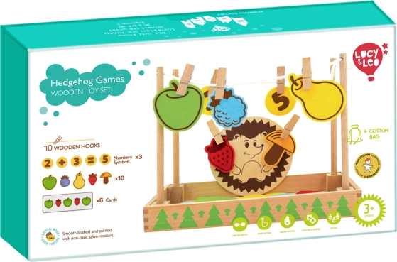 Setul include o bază din lemn, un arici, carduri distractive și pătrate colorate din pâslă - ideale și pentru jocurile în grup ale mai multor copii. Pentru depozitare ușoară, totul este ambalat într-un săculeț practic din bumbac.