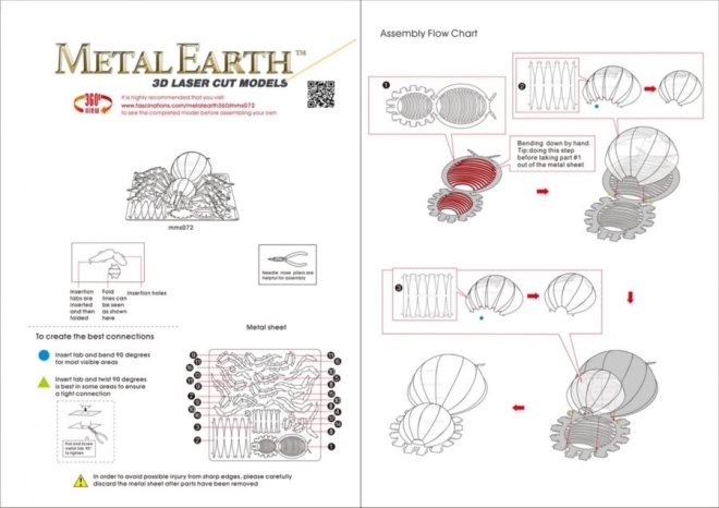 Scoateți piesele din plăcuțele metalice; dacă este necesar, folosiți cleștișori tăietori mici (nu sunt incluși). Piesele se îmbină între ele cu ajutorul unor încuietori formate dintr-un cârlig și un orificiu. Îndoiți cârligul cu ajutorul unor clești subțiri mici (nu sunt incluși) și îmbinați treptat toate încuietorile până când obțineți o piesă de artă foarte realistă!