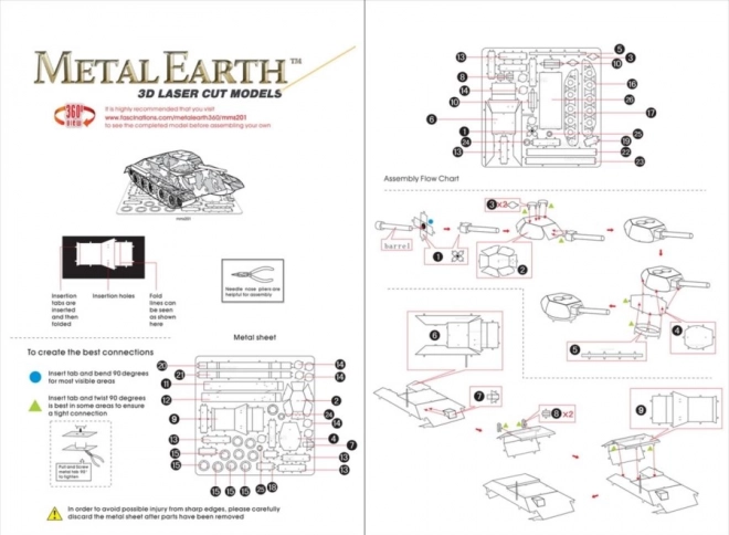 Scoateți piesele individuale din plăcuțele metalice; la nevoie folosiți un clește mic de tăiat (neinclus). Piesele se îmbină între ele cu ajutorul îmbinărilor formate din cârlige (lăbuțe) și orificii. Îndoiți cârligul cu un clește mic subțire (neinclus) și îmbinați treptat toate blocajele până când obțineți o piesă de rezistență foarte realistă!