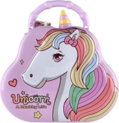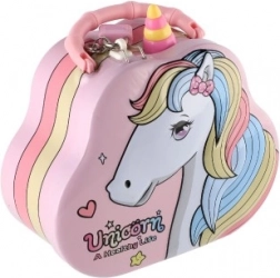 Pușculiță metalică pentru copii în formă de poșetă, cu motiv unicorn, ajută copiii să învețe să economisească și să numere. Are lacăt sigur, fante pentru monede și construcție metalică rezistentă într-un design pastel fermecător pe care copiii îl vor îndrăgi.