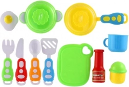 Dezvoltați imaginația copiilor cu acest set colorat de veselă pentru copii, 13 piese, care oferă totul pentru un joc realist de gătit. Include tigaie și oală cu capac, tocător, tacâmuri, ceașcă, ou ochi, „sos de roșii” și solniță. Ideal pentru copii de la 3 ani – pentru joacă creativă, sigură și educativă.