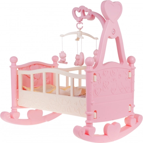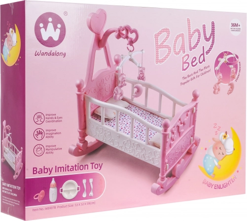 - pătuț – leagăn cu dimensiuni aprox. 53 cm x 42 cm x 59 cm, .- dimensiune interioară pătuț aprox. 48 cm x 22 cm, .- ursuleț pe carusel cu lungimea de aprox. 6 cm, .- biberon cu lungimea de aproximativ 12 cm, .- figurină cu dimensiuni de aproximativ 5,5 cm x 4 cm, .- agrafă/pieptene aprox. 13 cm x 9 cm x 3 cm, .- plapumă cu dimensiuni aprox. 43 cm x 23 cm, .- bol cu diametrul de aprox. 12 cm, .- lingură și furculiță cu lungimea de aprox. 11 cm, .- ambalaj aprox. 69 cm x 55 cm x 82 cm . |