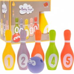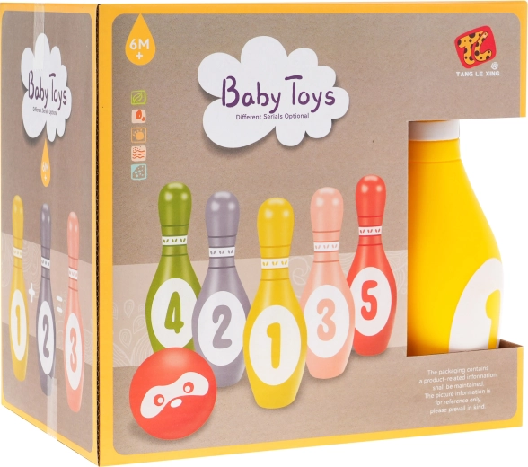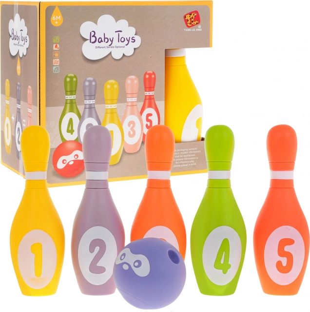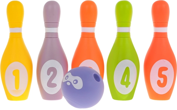 - Conținutul pachetului: 5 popice numerotate (1–5) și 1 mingiuță din spumă cu chip.