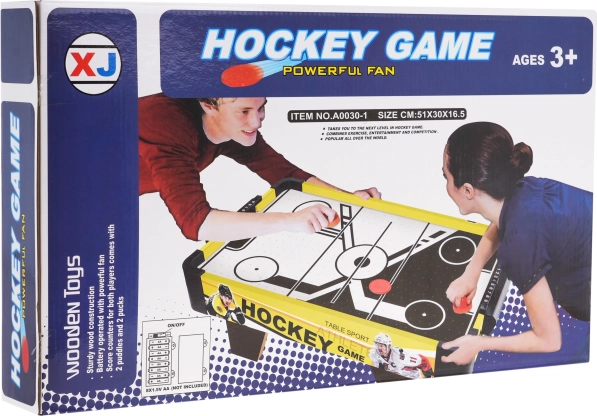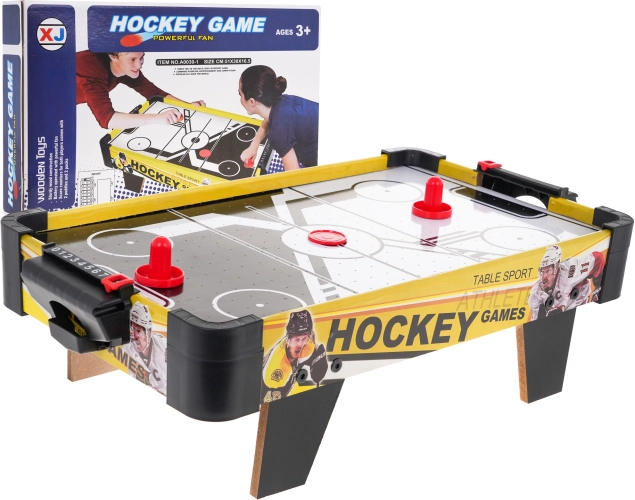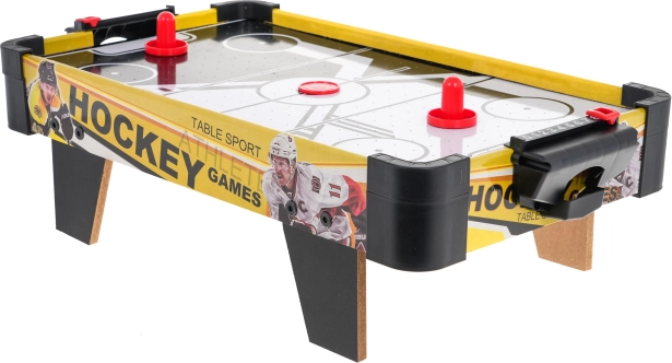 Cymbergay - masă de air hockey pentru copii de la 3 ani. AIR HOCKEY - este un tip de joc arcade popular destinat pentru doi jucători. Pentru joc se folosește o masă special pregătită. Suprafața mesei este acoperită cu orificii prin care este suflat aer. Astfel se creează o pernă de aer pe care pucul alunecă fără contact cu suprafața. Jucătorii stau pe părți opuse ale mesei. Fiecare jucător folosește un instrument special din plastic, uneori numit „burete”, care servește drept paletă. Cu acest instrument jucătorii lovesc pucul. Scopul jocului este să introduci pucul în poarta adversarului. Pucul se deplasează cu viteză mare. Jocul se încheie de regulă când unul dintre jucători atinge un număr prestabilit de puncte (de obicei șapte sau nouă) sau după expirarea unui timp limită stabilit. Masă |