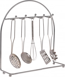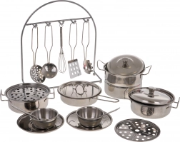 Datorită suportului practic cu cârlige, copiii au toate ustensilele de bucătărie metalice mereu la îndemână – de la polonic și tel la lingură perforată sau spatulă. Setul include, de asemenea, farfuriuțe, boluri și suport pentru oală, astfel încât micii bucătari să învețe și servirea „preparatelor”.