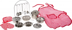 Setul de bucătărie pentru copii, realist și metalic, include până la 23 de piese, printre care oale cu capace, tigaie, ustensile, farfuriuțe și un set de bucătar cu șorț și mănușă termică. Datorită construcției metalice, echiparea este durabilă, ușor de curățat și oferă o joacă realistă de gătit pentru copii de la 3 ani. Suportul practic cu cârlige păstrează accesoriile ordonate și la îndemână și susține dezvoltarea motricității fine și a imaginației.