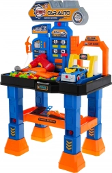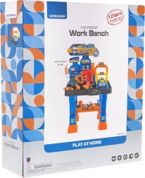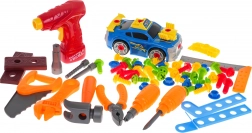 Setul include 125 de piese accesorii: unelte (ciocan, fierăstrău, clește, chei), șurubelniță electrică pe baterii, șuruburi, biți, capete și autocolante decorative. Mașinuța poate fi dezasamblată și personalizată, ceea ce sprijină gândirea tehnică și coordonarea mână–ochi. Bancul de lucru stabil se asamblează ușor și este ideal pentru joaca de acasă.
