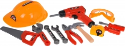 Fierăstrău, ciocan, clește, șurubelnițe, chei, menghină, roți dințate, elemente de îmbinare, ochelari și cască – totul pentru joacă sigură și creativă.
