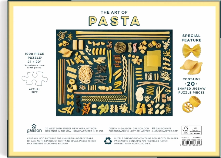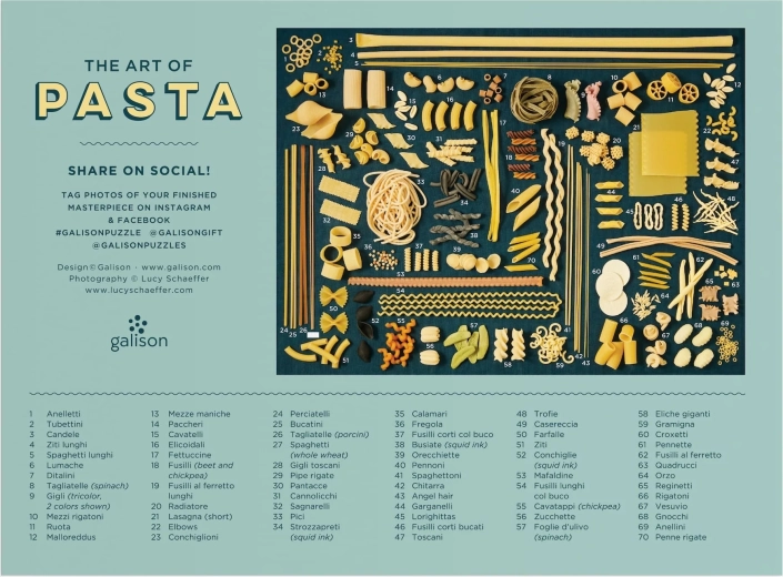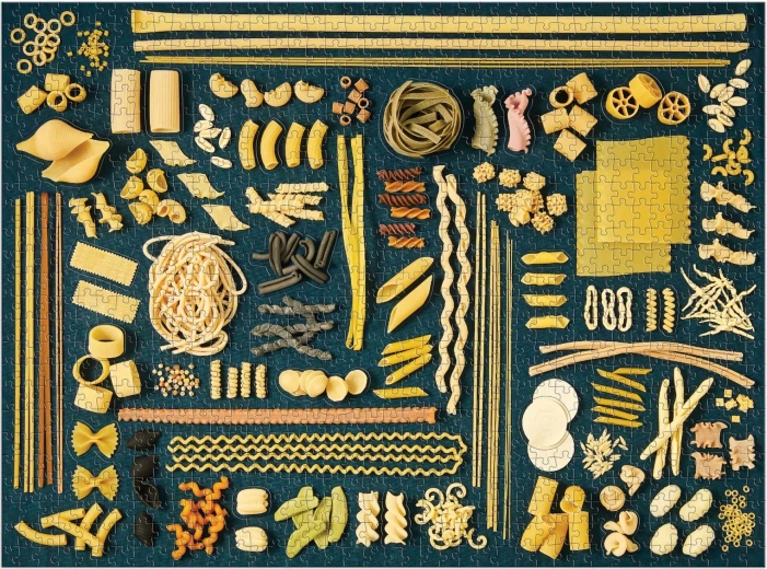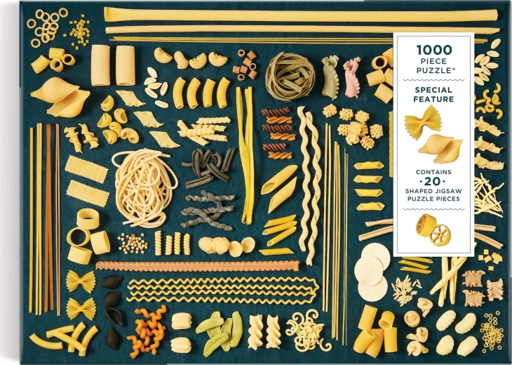 Puzzle-ul conține 20 de piese speciale în formă de paste. Pachetul include și modelul de referință al imaginii de asamblat. Dimensiunea puzzle-ului asamblat este de aproximativ 69 x 51 cm
