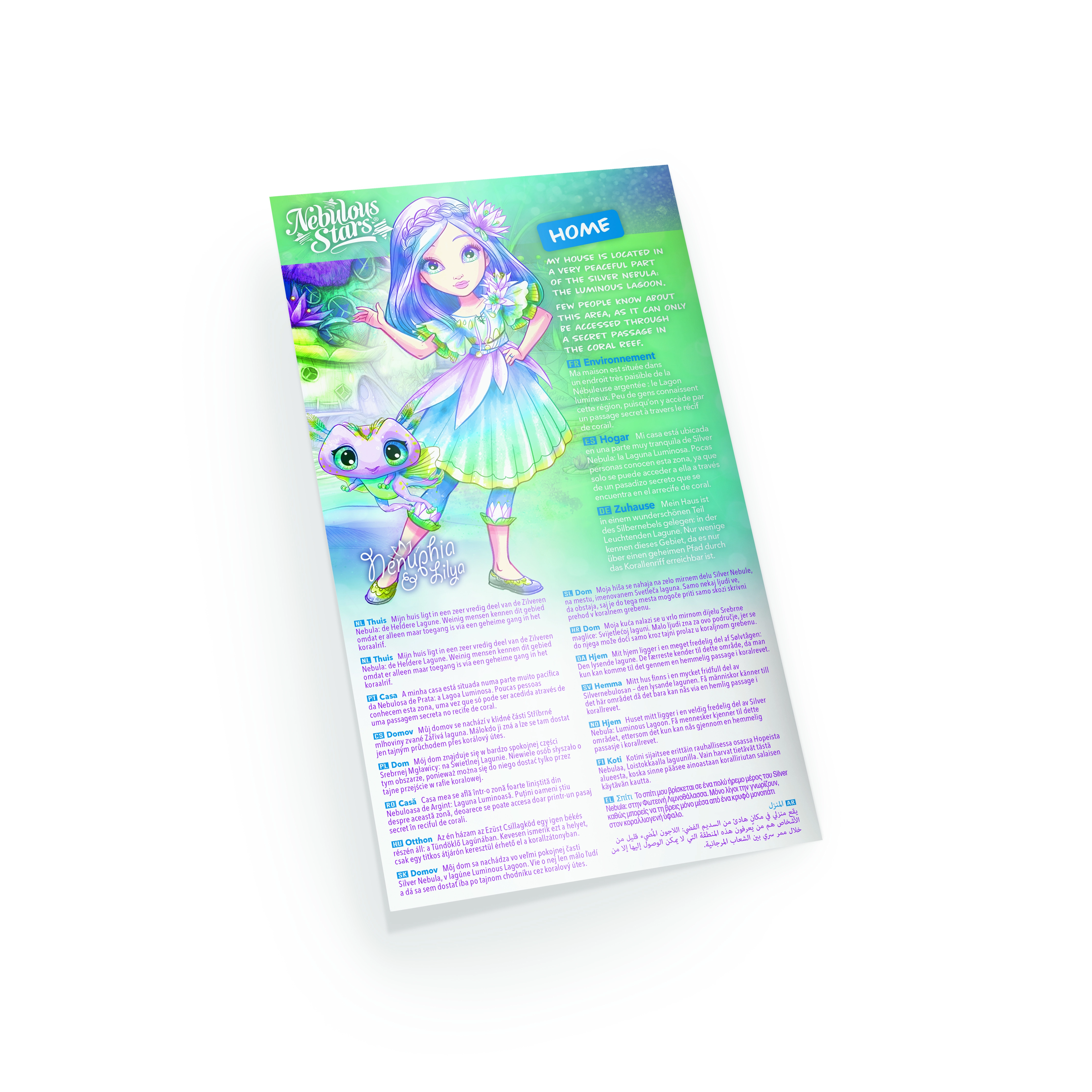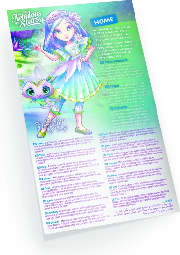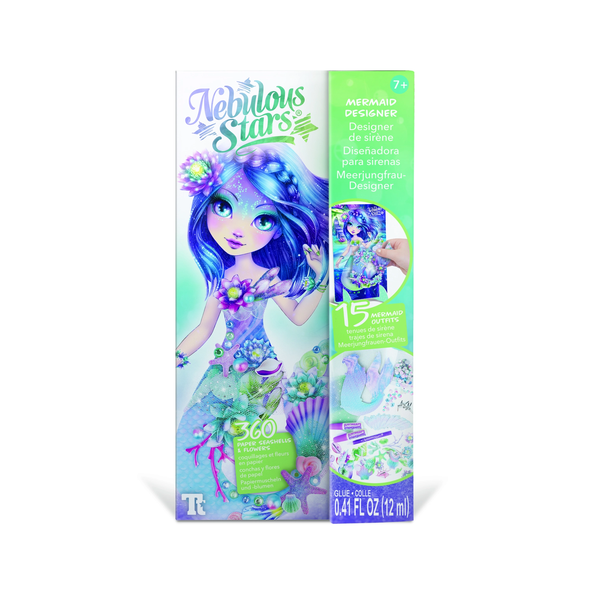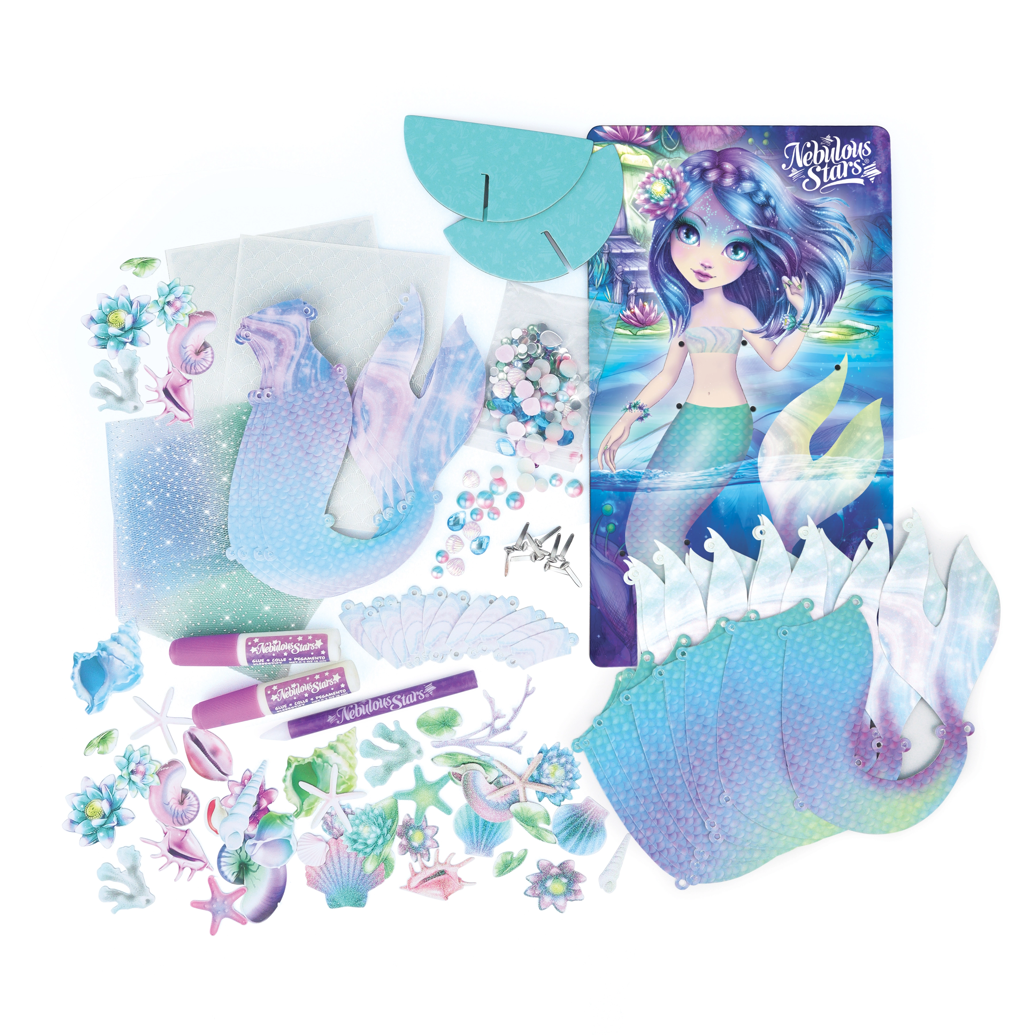 Îmbracă zâna magică a mării, Nenuphia, în stiluri proprii cu acest set creativ NEBULOUS STARS. Copiii se vor bucura de creație datorită 25 de șabloane din hârtie, 360 de scoici și flori din hârtie, pietricelelor și insigne-lornete decorative. Setul include și un suport din carton, ștampile, lipici, panglică și un aplicator tip pix pentru pietre prețioase pentru decorare ușoară.
