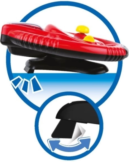 Mașina cu lumini aprinse se deplasează pe ecranul mobil. Datorită claxonului, copilul poate claxona și îi poate avertiza pe șoferii indisciplinați. Volanul are un suport reglabil.