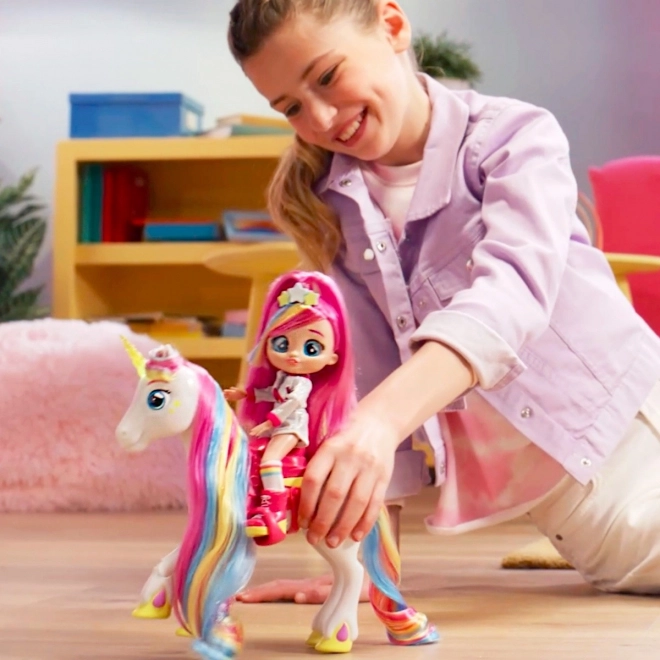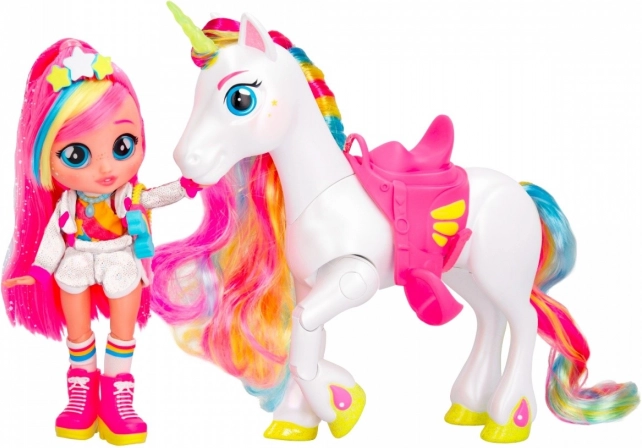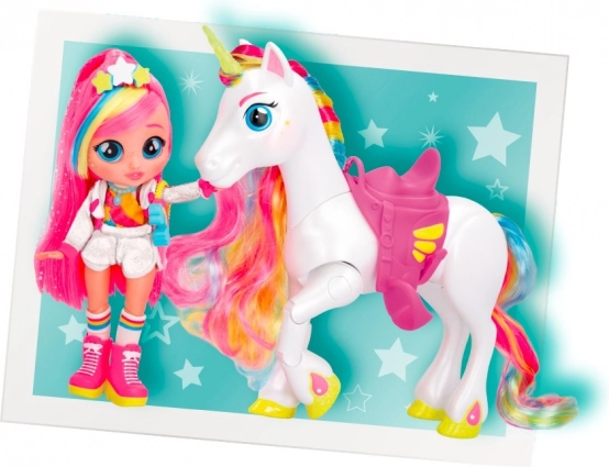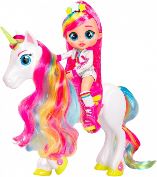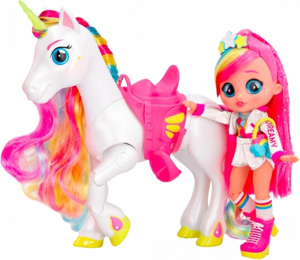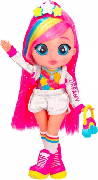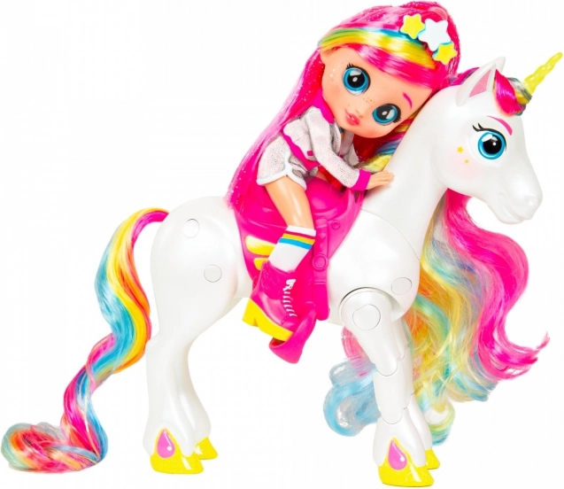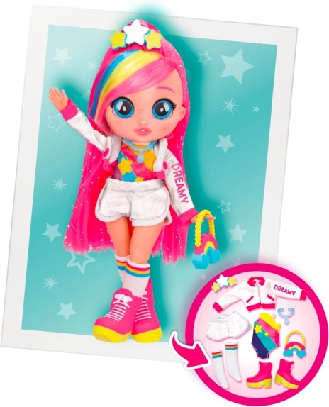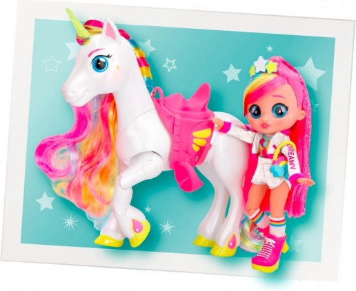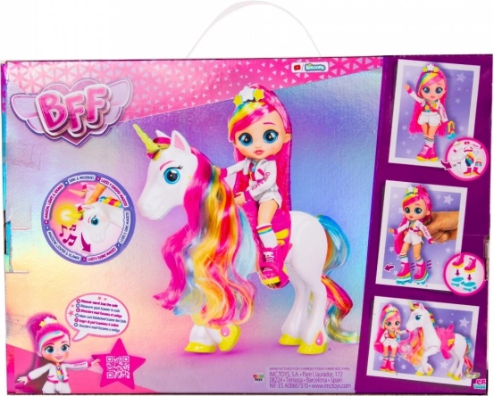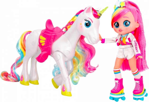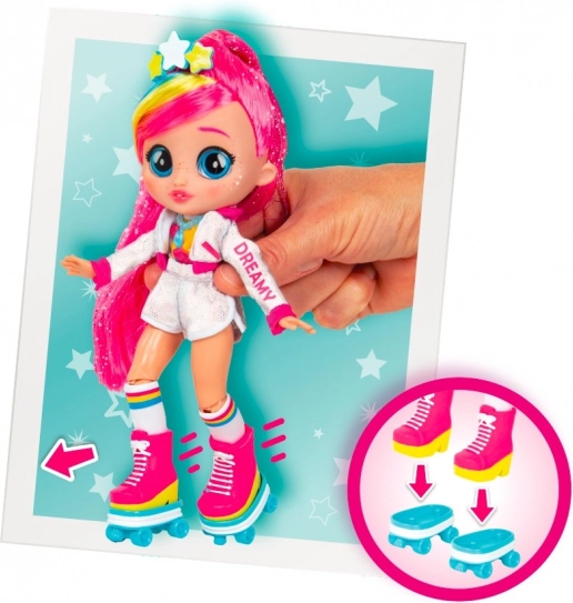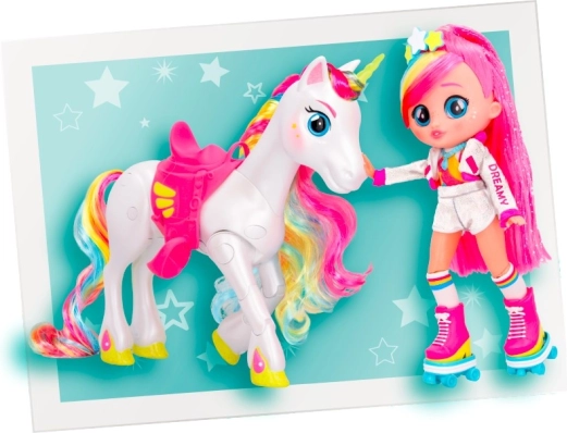 Cu păpușa BFF Dreamy și unicornul ei Rym, joaca poate fi și mai distractivă. Cornul lui Rym se aprinde și emite sunete atunci când îi apeși capul. Este un moment magic, iar reluarea lui este o mare distracție, mai ales pentru că Rym poate reda șase sunete diferite. Dreamy și Rym pot adopta poziții haioase. Dreamy are păr lung, colorat și strălucitor, ochi de sticlă, iar ținuta ei amintește de o patinatoare artistică. Setul include și role, pentru ca Dreamy să poată simula mersul pe patine, precum și o șa, pentru ca Dreamy să poată călări pe spatele lui Rym. Trăiește aventuri unice cu Dreamy și Rym!