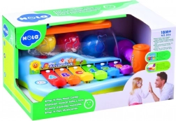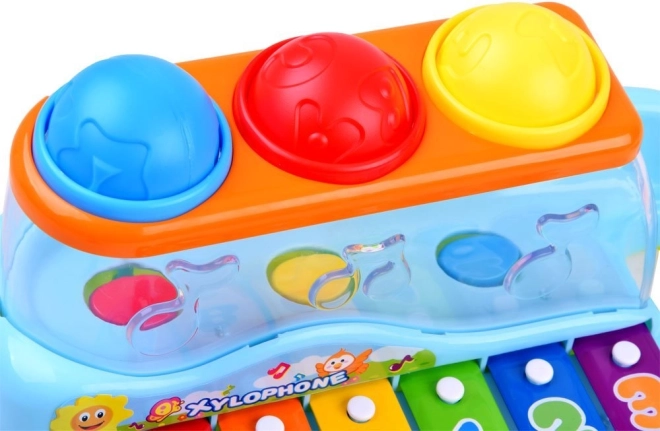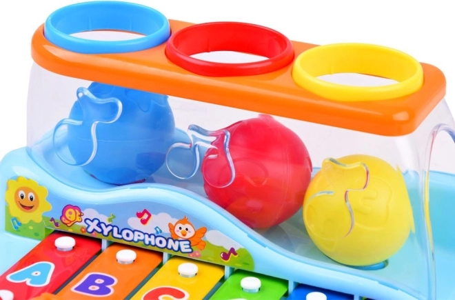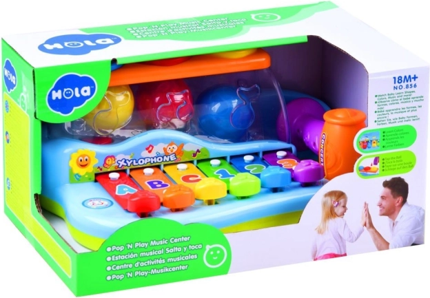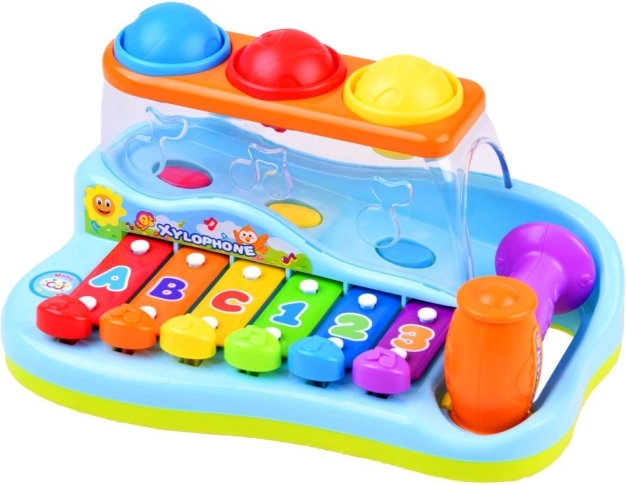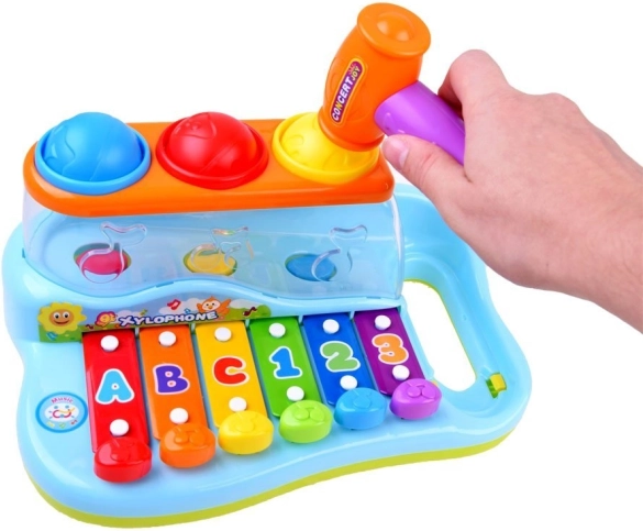 Copiii pot lovi clapele cu ciocanul sau pot introduce mingile prin deschizături, generând astfel alte melodii plăcute. Clapele sunt marcate cu cifre și litere, ceea ce ajută în plus copiii să învețe și să memoreze secvența atingerilor. Acest xilofon este modalitatea perfectă de a încuraja curiozitatea și interesul pentru lume la cei mici.