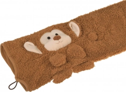 Descoperiți 2‑în‑1: o pătură catifelată pe care o rulați în câteva clipe și o fixați sub forma unei maimuțici de pluș. Copiii o adoră pentru textura pufoasă și atingerea liniștitoare, iar părinții pentru portabilitatea practică și întreținerea ușoară. Culoarea neutră moka se potrivește frumos cu orice trusou.