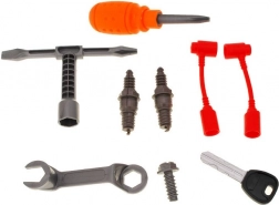 Setul conține unelte pentru copii: șurubelniță în cruce, cheie 3‑în‑1 (tubulară + plată + în cruce), cheie 2‑în‑1 (plată + inelară) și alte accesorii. Copiii exersează operațiuni mecanice de bază într‑un mod sigur.
