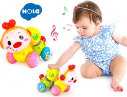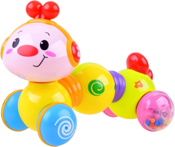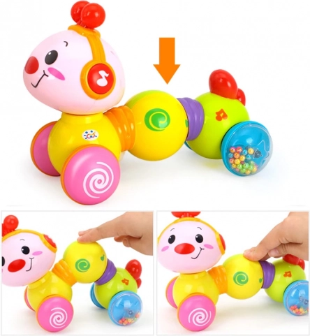 Apasă-i spatele, iar omida se întinde și pornește înainte. Motivează excelent mersul de-a bușilea și susține motricitatea grosieră.