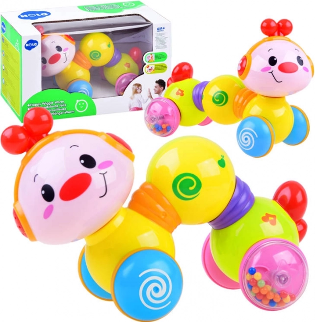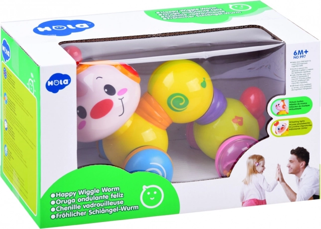 Omidă interactivă pe roți Happy Wiggle Worm este jucăria ideală pentru bebeluși și copilași. La apăsarea spatelui, omida se întinde și pornește înainte pe suprafețe plane, în timp ce capul își schimbă culorile și se aud melodii plăcute. Capul rotativ încurajează curiozitatea și motricitatea fină.