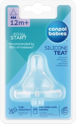 Tetina Canpol Babies cu gât larg este fabricată din silicon de calitate, fără gust și miros, ceea ce nu modifică gustul alimentelor oferite. Forma și materialul proiectate imită forma naturală a mamelonului matern, permițând o tranziție ușoară între alăptare și hrănirea cu biberonul.
