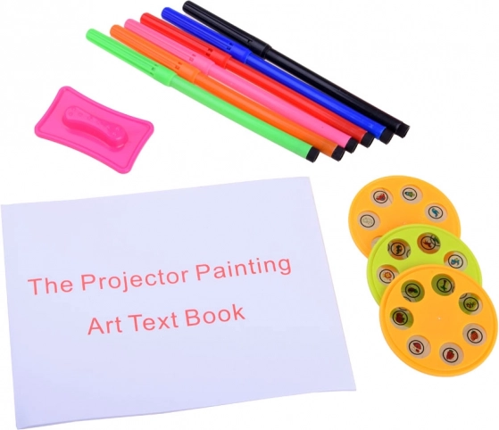- Proiector cu coroniță, 3 discuri cu modele, 6 markere, caiet de desen, burețel