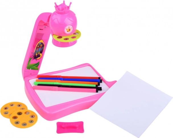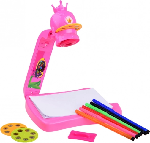 Dezvoltați imaginația copiilor cu acest proiector roz pentru desen, cu coroniță. Datorită șabloanelor proiectate și setului de markere, micii artiști învață ușor să traseze și să creeze. Setul include 3 discuri cu modele, 6 markere colorate, caiet de desen și o construcție compactă pliabilă pentru depozitare facilă.