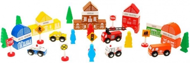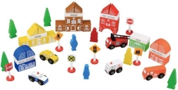 Blocurile au o textură plăcută și sunt de mărime potrivită pentru mâinile micilor copii. Exemple de dimensiuni: clădiri (aprox. 3cm x 6cm x 3cm), ambulanță (3,5cm x 5cm x 3cm), mașină de pompieri (5,5cm x 8,5cm x 3cm), poliție (4cm x 6cm x 3cm), figurine (5cm x 2,5cm x 1cm), semne de circulație (înălțime 7cm) realizate din plastic.