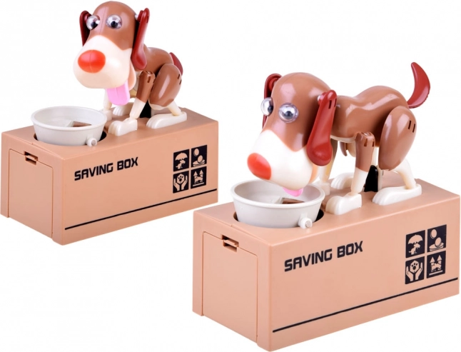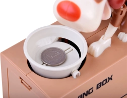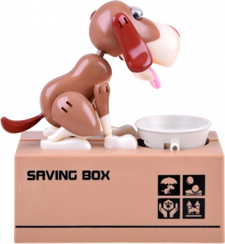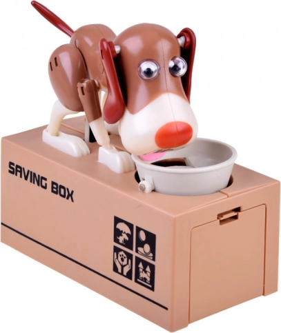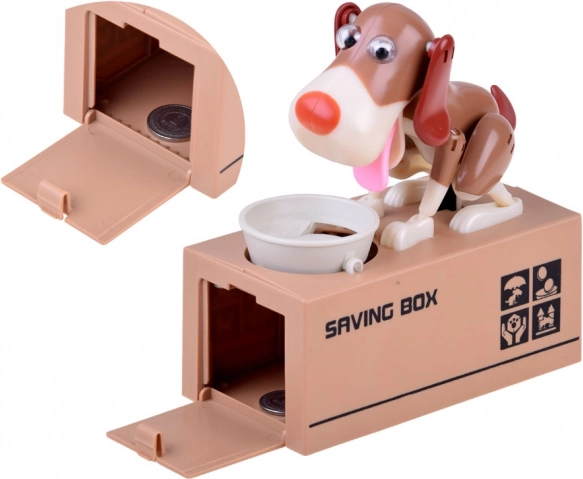 Introduceți moneda în bolul din fața câinelui. Câinele începe să se miște ca și cum ar mânca mâncarea din bol, ceea ce face ca moneda să cadă în pușculiță. Câinele se mișcă vesel și își scutură urechile. Pentru funcționare sunt necesare 3 baterii. Pușculița ajută copiii să înțeleagă că economisirea este nu doar distractivă, dar aduce și rezultate pozitive.