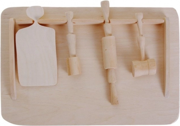 Descoperiți un set de bucătărie pentru copii din lemn natural – planșetă, tocător, sucitor, pisălog și ciocănel. Ideal pentru micii ajutoare care vor să pregătească bunătăți alături de adulți. Setul este sigur, ușor și rezistent, sprijină motricitatea fină și creativitatea. Lemn natural, prelucrare tradițională și învățare distractivă a gătitului într-un singur set.
