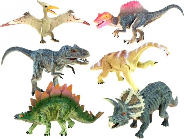 Setul include șase tipuri diferite de dinozauri, precum T-Rex, Stegosaurus și alții, oferind o gamă largă pentru joc și învățare.