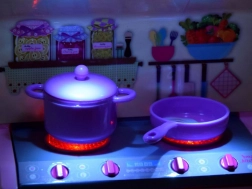 Tigăi, oale, ceainic și farfurii – tot ce au nevoie copiii pentru a imita activitățile reale.
